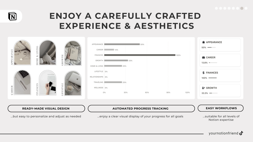 Category Pages: Dive deeper into each goal category with dedicated spaces to focus, organize, and plan. Use these pages to break down your goals into actionable steps, set timelines, and track progress within each area of your life. The ready-to-use categories include appearance, growth, career, home & living, lifestyle, finances, travel, relationships, and wellness.