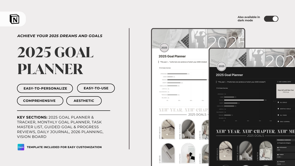 Introducing the 2025 Goal Planner Notion template – the all-in-one tool to help you set goals, track progress, and stay focused on what matters most.