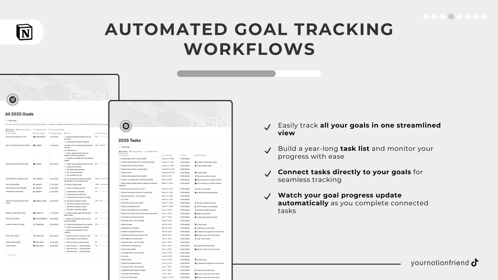 2025 All Goals: Set and track your goals for the year with automated progress updates as you complete key tasks. Enjoy different progress visualizations integrated throughout the template to keep you motivated and focused.