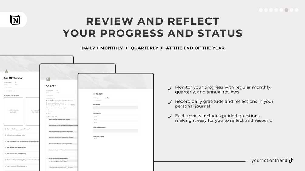 Guided Goal & Progress Reviews: Leverage a structured review system to evaluate your progress on a monthly and quarterly basis, celebrate milestones, and set actionable priorities for the months ahead. At the end of the year, reflect on your overall achievements with the dedicated annual review.