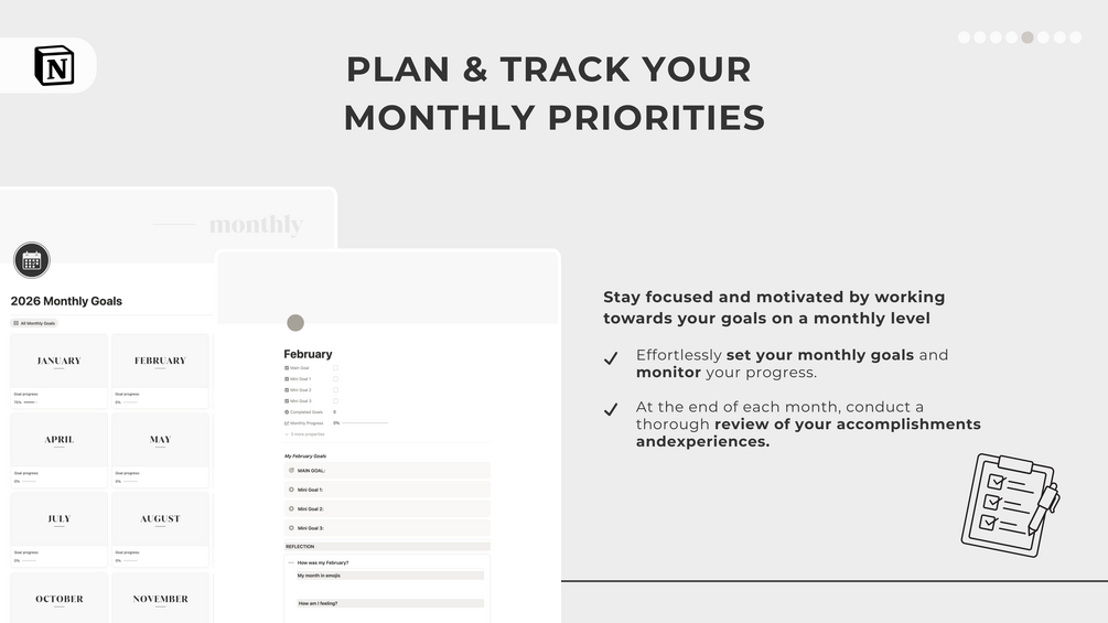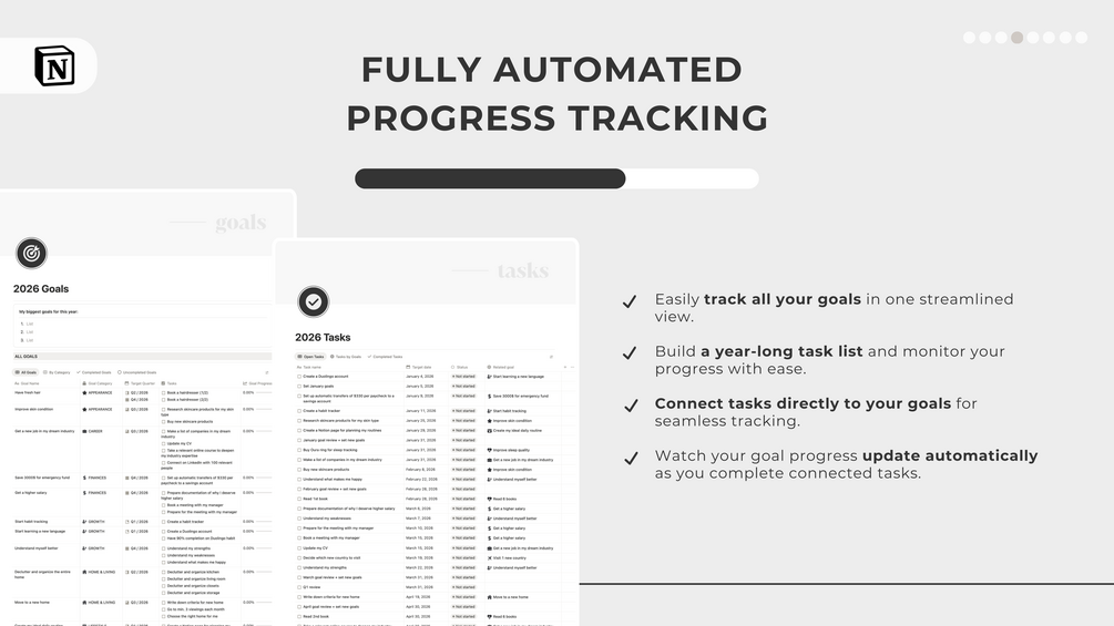 2026 All Goals: Set and track your goals for the year with automated progress updates as you complete key tasks. Enjoy different progress visualizations integrated throughout the template to keep you motivated and focused.