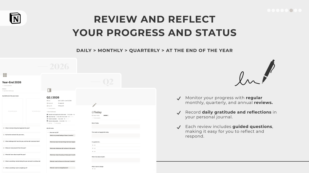 Guided Goal & Progress Reviews: Leverage a structured review system to evaluate your progress on a monthly and quarterly basis, celebrate milestones, and set actionable priorities for the months ahead. At the end of the year, reflect on your overall achievements with the dedicated annual review.