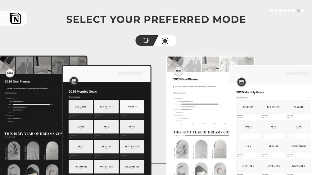Please note that the template is optimized for laptop screen size. It will work also on tablets and mobile phones, but I can't guarantee that it will be optimized for every screen size. This Notion template comes in both light and dark modes. After your purchase, you'll automatically gain access to both versions and can choose your preferred one.