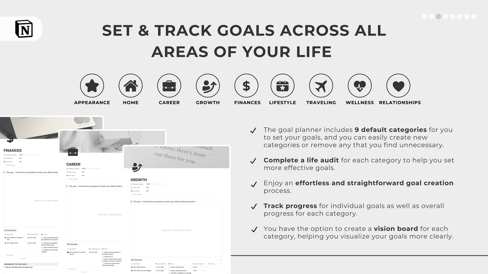 Category Pages: Dive deeper into each goal category with dedicated spaces to focus, organize, and plan. Use these pages to break down your goals into actionable steps, set timelines, and track progress within each area of your life. The ready-to-use categories include appearance, growth, career, home & living, lifestyle, finances, travel, relationships, and wellness.