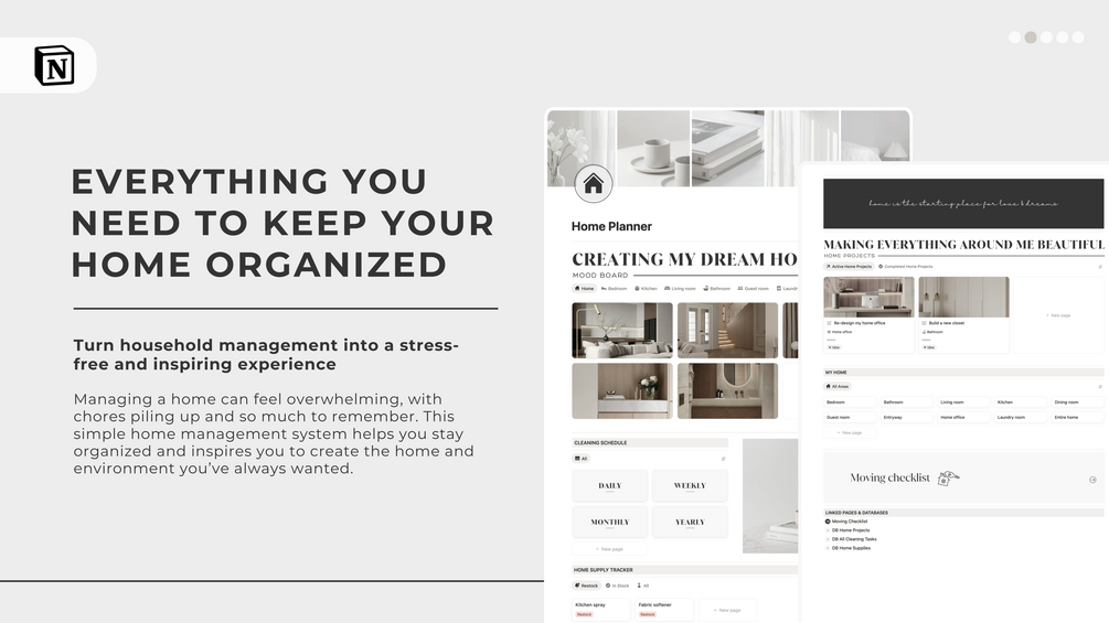 Take control of your home with the Household Management Planner. Managing a household can feel overwhelming, with tasks piling up and too much to keep track of. This Notion template brings everything into one clear, easy-to-use system.