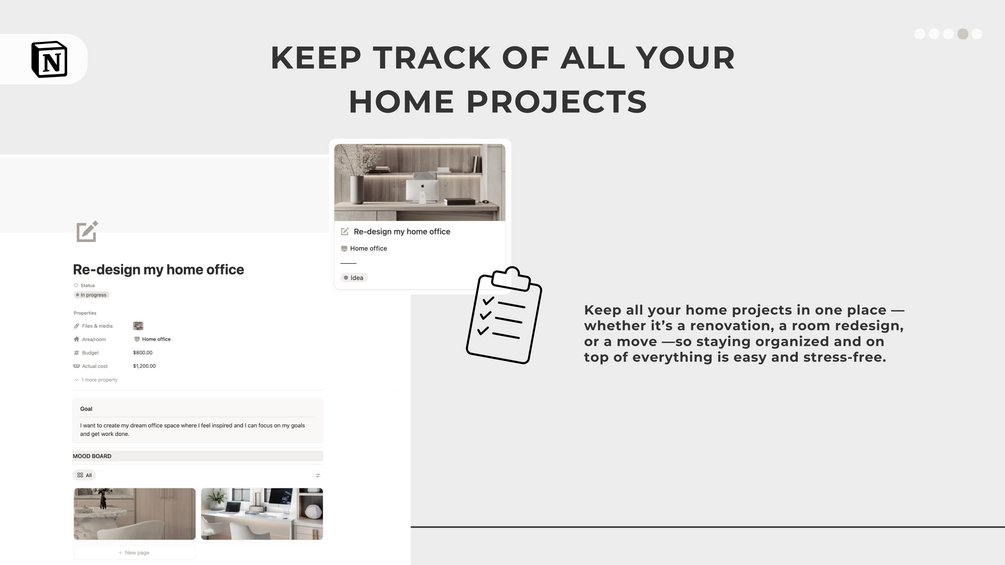 Home Projects Tracker: Whether you're looking for a new home, renovating, or simply enhancing an area, keep all your project information neatly organized in one convenient location.