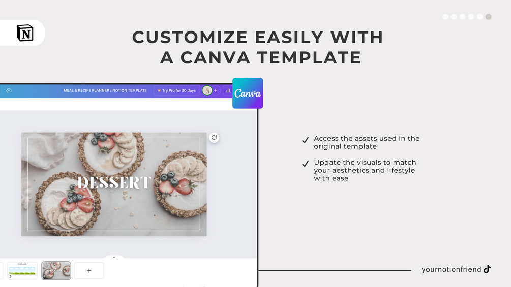Additionally, the Notion template includes a link to the original Canva template. There, you can conveniently personalize the cover images, and easily customize the other visuals to your unique style.