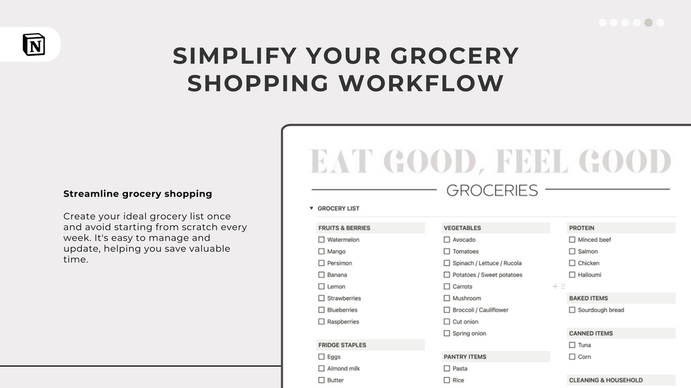 Grocery List: Streamline your weekly grocery shopping with a pre-categorized list of staples, making planning and shopping more efficient.