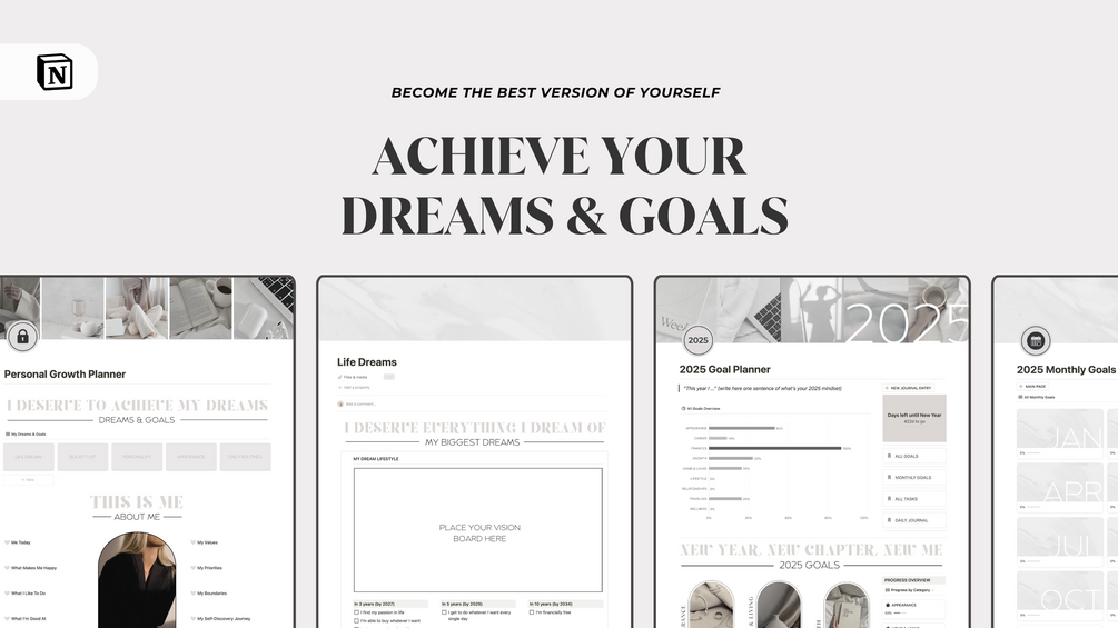 This Notion template bundle equips you with everything necessary to define, set, track, and achieve your dreams and goals. đ¤